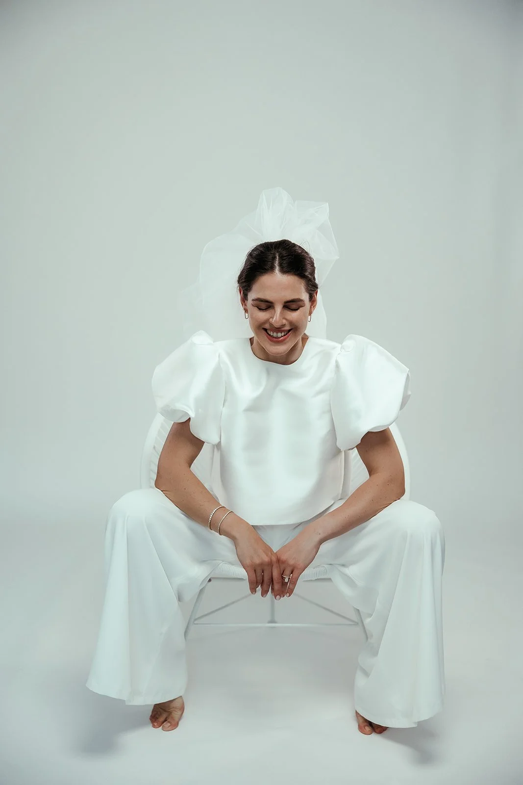 Eine lachende Frau im weißen Brautkleid mit großen Puffärmeln in einem Ankleidezimmer.